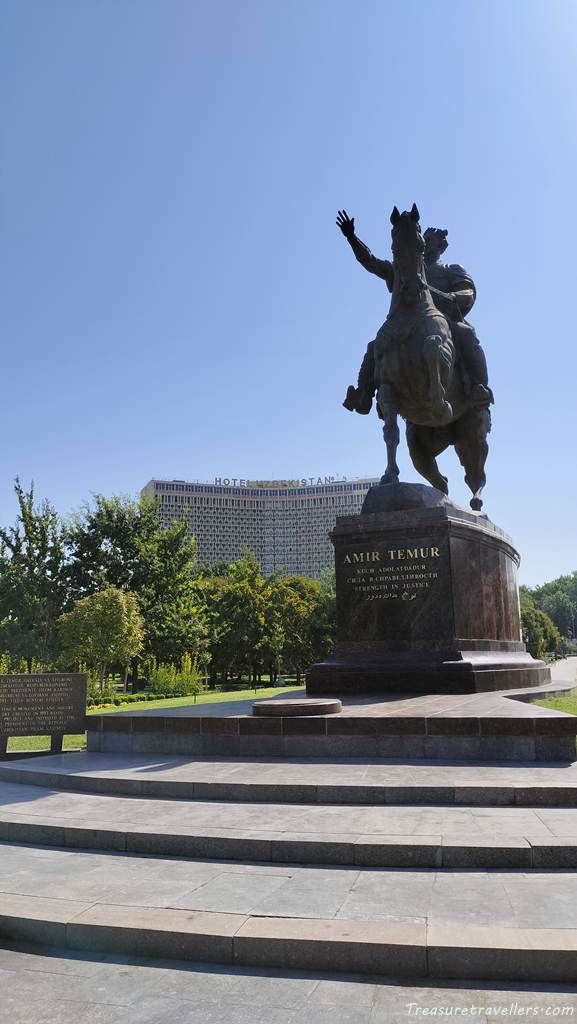 その後体調不良の身体に鞭打って、これまた名所となっている、「ホテル ウズベキスタン」そしてその目の前に立つ「アミール・ティムール像」を見に行きました。