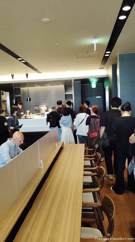 その列が木目調のラウンジエリアいっぱいにつながっているため、席の半分くらいが列に飲まれて使えないという残念な状態…
